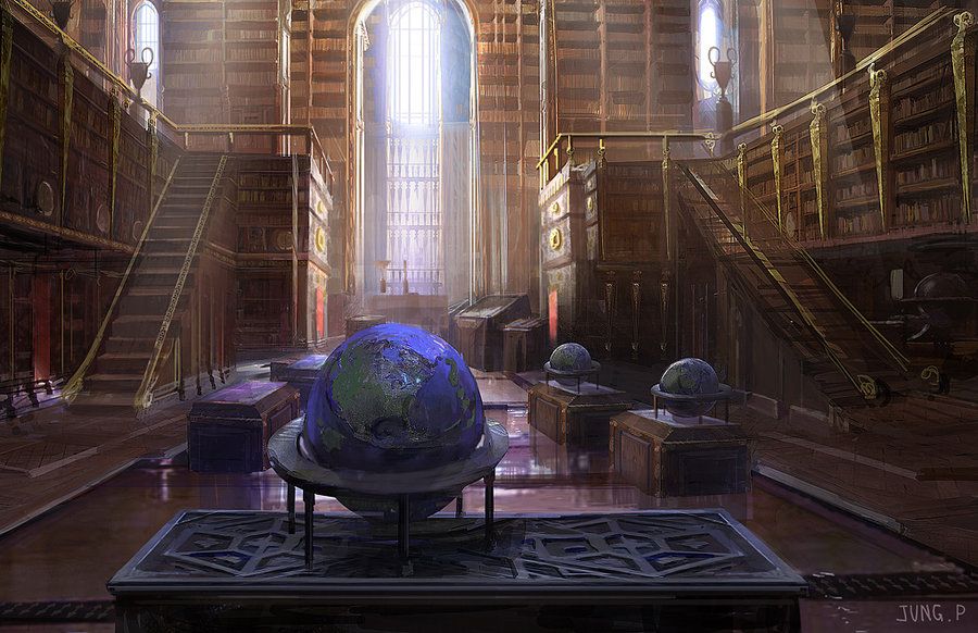 Je suis entrée et il faisait sombre, c’était une grande bibliothèque j’ai descendu les marches et je me suis dirigée vers un endroit lumineux.  Il y’avait là une table avec un livre ouvert à droite et un grand bassin en forme de coquillage. Il y’avait un liquide dans ce bassin et comme avec la pensine,  je voyais des images.